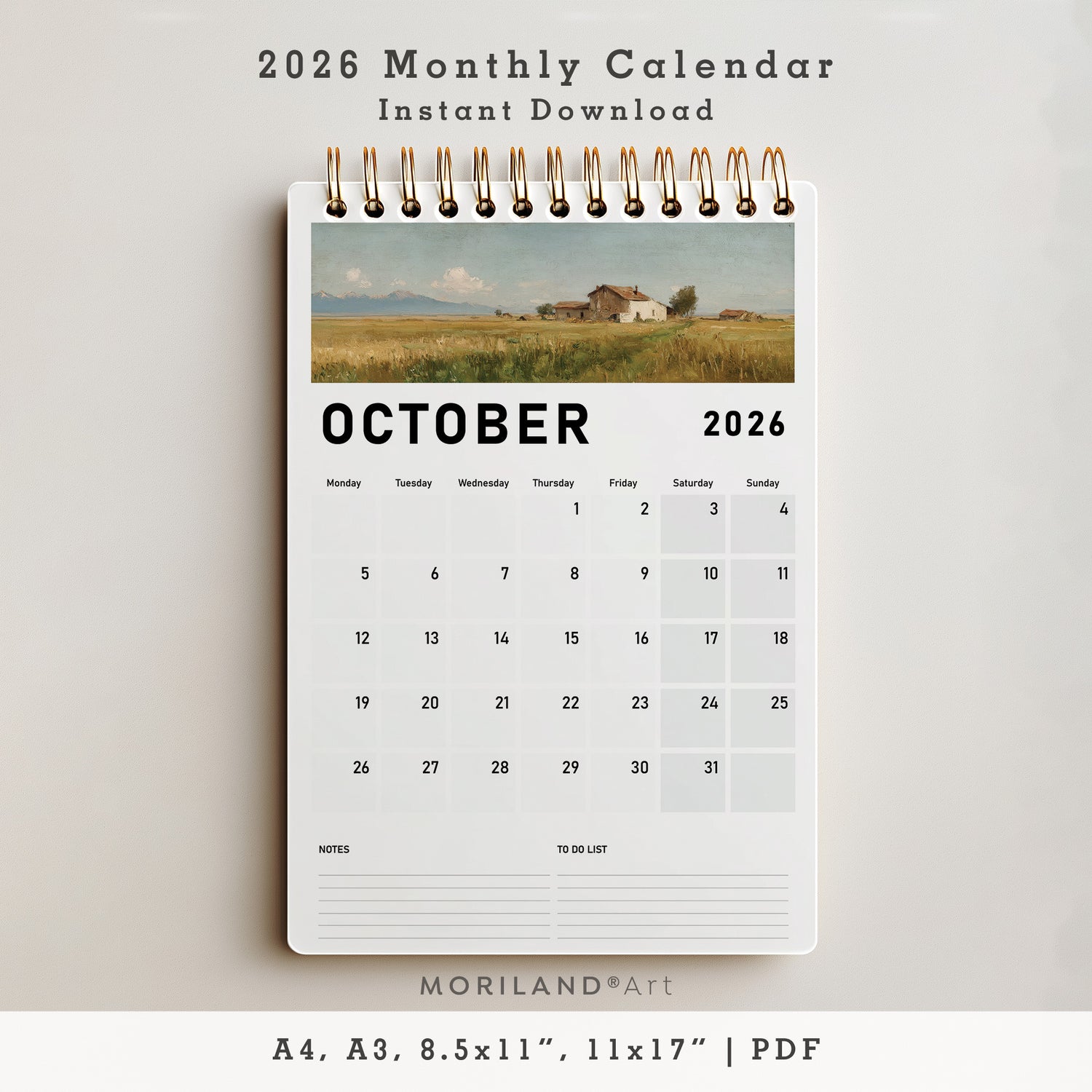 2026 Monthly Calendar | Vintage Landscape Oil Painting Style - PDF (Digital Download) - A4, A3, 8.5x11" and 11x17" is backordered and will ship as soon as it is back in stock.