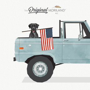 Pale Blue Classic Truck with Black Labrador Dog Holding American Flag Print - Printable Art