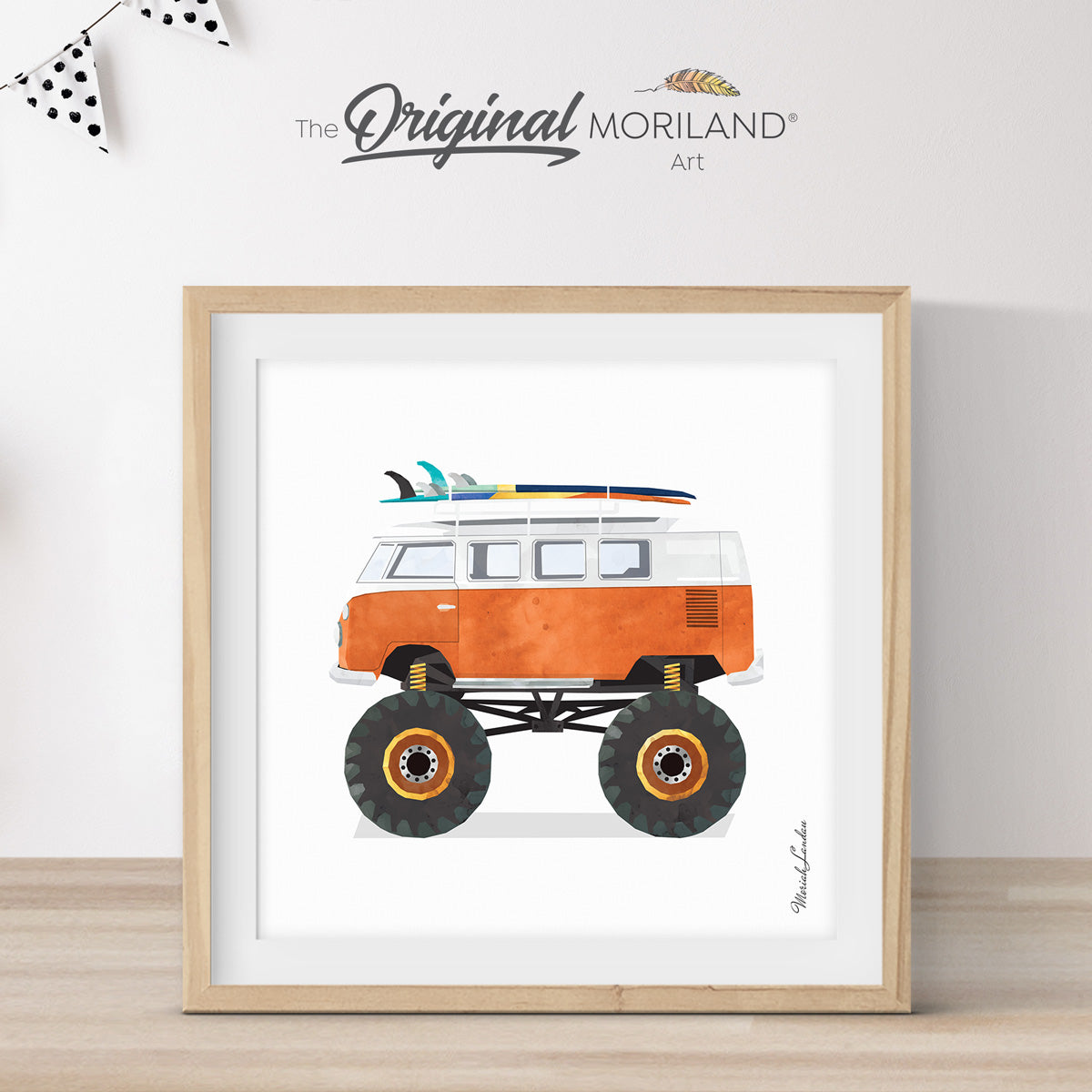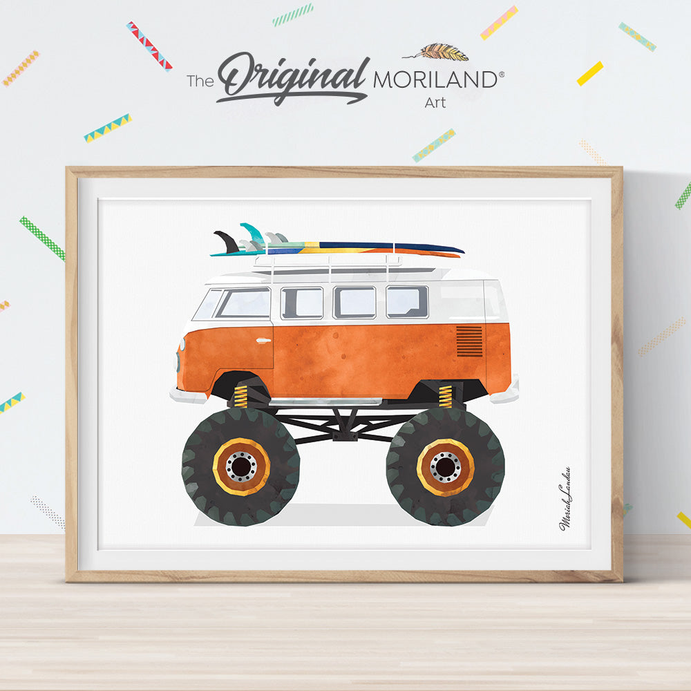 Burnt Orange Monster Truck Van with Surfboard Print - Printable Art - 8x10, 16x20" and 40x50cm is backordered and will ship as soon as it is back in stock.